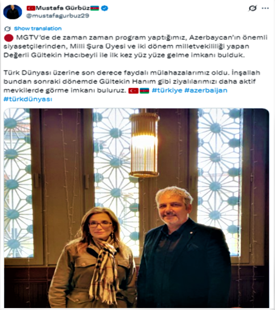Ayrıca, 10 Mayıs 2025 tarihinde Mustafa Gürbüz Gültekin Hacıbeyli çektirdiği resmi paylaşmış ve şu cümleleri yazmıştı: ‘’ MGTV’de de zaman zaman program yaptığımız, Azerbaycan’ın önemli siyasetçilerinden, Milli Şura Üyesi ve iki dönem milletvekililiği yapan Değerli Gültekin Hacıbeyli ile ilk kez yüz yüze gelme imkanı bulduk. Türk Dünyası üzerine son derece faydalı mülahazalarımız oldu. İnşallah bundan sonraki dönemde Gültekin Hanım gibi ziyalılarımızı daha aktif mevkilerde görme imkanı buluruz.’’