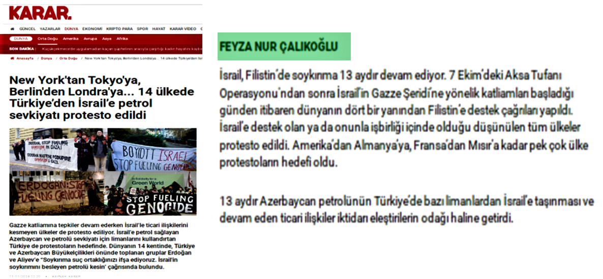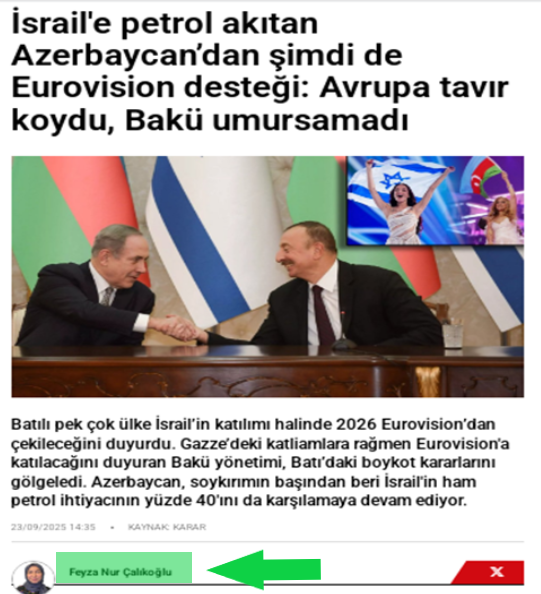 "Gergerlioğlu'ndan Bakü'de Aliyev'e İsrail tepkisi: Bakü - Ceyhan'dan İsrail'e yakıt gidemez" haberi de imza belirtilmemiş olsa bile, yazı tarzından ve yaklaşımından Feyza Nur Çalıkoğlu'ya ait olduğu hemen belli oluyor.