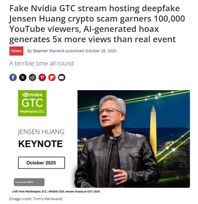 NVIDIA'nın konferansı sırasında YouTube'da yayınlanan sahte bir canlı yayında, şirketin CEO'su Jensen Huang'ın deepfake versiyonu bir kripto para dolandırıcılığını tanıtıyordu. Sahte yayın zirvede 95 bin izleyiciye ulaşırken, gerçek yayını yalnızca 12 bin kişi izliyordu