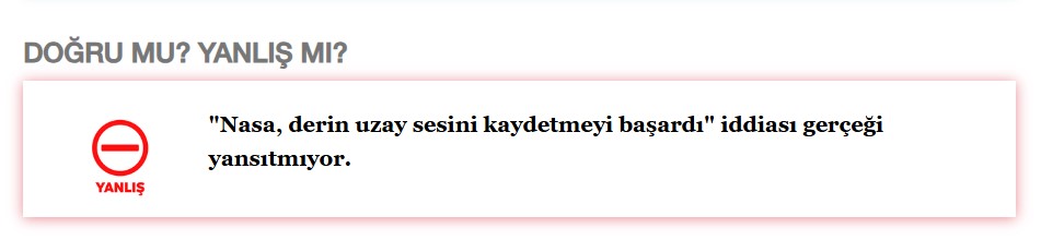- AA Teyit Hattı'na ses kaydı ile ilgili açıklamada bulunan Doç. Dr. Hasan Ak, mutlak boşluğun bulunduğu uzayda klasik seslerin yayılmasının mümkün olmadığını belirtti.