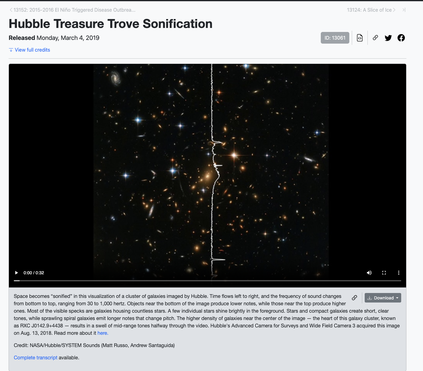 NASA tarafından "Hubble Treasure Trove Sonification" başlığıyla paylaşılan kaydın, Hubble Uzay Teleskobu’nun görüntülediği bir galaksi kümesine ait görsel verilerin sese dönüştürülmesiyle oluşturulduğu belirtildi. Çalışmada uzaydan doğrudan bir ses kaydı alınmadığı, teleskop verilerinin belirli kurallar çerçevesinde “seslendirildiği” ifade edildi.
