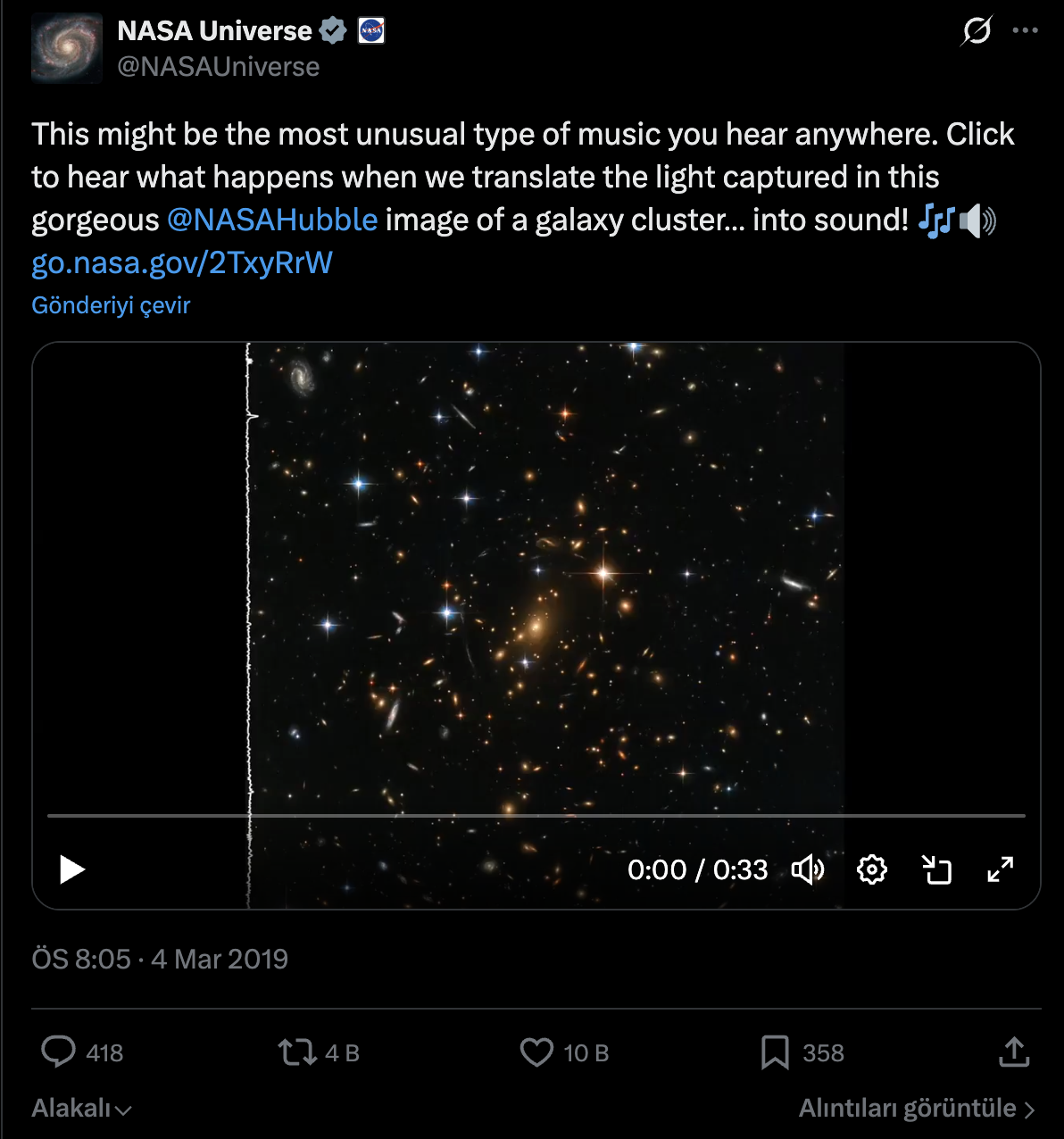 - 2019'da NASA tarafından yayınlanan kayıt, Hubble Uzay Teleskobu’nun görüntülediği bir galaksi kümesine ait görsel verilerin sese dönüştürülmesiyle oluşturuldu.