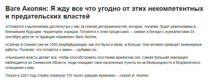 Parlamentdəki “Ermənistan” blokunun deputatı Vahe Akopyan bildirib ki, Sünik (Zəngəzur) vilayətindən də ciddi mühacirət başlayıb. “Ən böyük mühacirət mənz bu vilayətdədir. Ermənistan hakimiyyəti kəndlərin boşalmasına şərait yaradır. İnsanlar çarəsizlikdən öz yaşayış yerlərini tərk edirlər”.