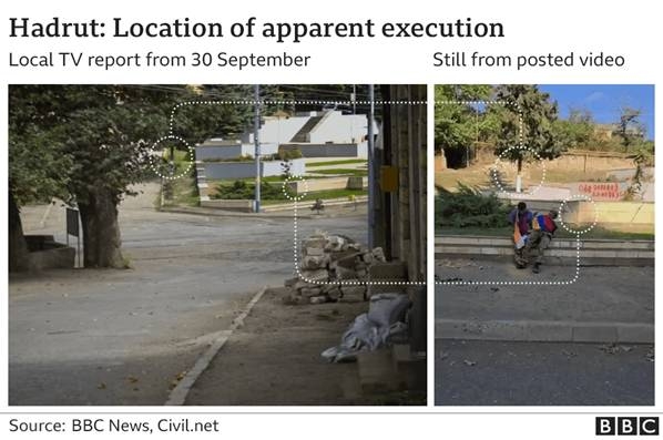 Ötən ilin oktyabr 15-də sosial şəbəkələrdə Azərbaycanın işğaldan azad olunmuş Hadrut şəhərində 2 mülki şəxsin güllələnməsi ilə bağlı video yayıldı. Həmin video ermənilər tərəfindən “Azərbaycanın növbəti hərbi cinayəti” kimi təqdim olunurdu. Elə həmin gün məşhur faktyoxla saytı olan Bellingcat böyük analiz yazısı ilə çıxış etdi, daha sonra isə BBC-də Qriqor Atanesyan və Bencamin Strikin həmmüəllifliyi ilə Bellingcat-a istinadən “Dağlıq Qarabağ münaqişəsi: edamla bağlı video hərbi cinayət araşdırmasını tələb edir” araşdırma yazısı təqdim edildi.