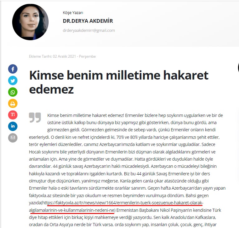 Türkiyə ictimaiyyəti Faktyoxla Lab. saytının türkcə versiyasında dərc olunan “Ermənilərin Türk sözünü həqarət kimi başa düşmələrinin və təhqir kimi istifadə etmələrinin səbəbi nədir?!” başlıqlı yazıdan olduqca qəzəblənib.