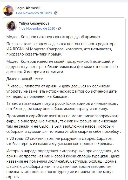 REGNUM İnformasiya Agentliyinin baş redaktoru Modest Kolerovun sosial şəbəkələrdə fikirləri yayılıb. İddia olunur ki, Kolerov erməni tarixi və siyasəti haqqında ifşaedici fikirlər söyləyib. Halbuki Modest Kolerov hər zaman Anti-Azərbaycan mövqeyi ilə seçilib, erməni yanlısıdır. Məqalədə qeyd olunur: “Ermənilərin cəfəng iddialarını oxuyarkən heyrətlənirsən və bu millətin uzunqulaq inadkarlığına baxmayaraq, onların Qafqaza ilk gəlişinə dair təkzibedilməz faktları görməyə bilmirsən. XVIII əsrdə rus əsgər və çinovniklərinin sayəsində indi onlar ölkəyə və paytaxta sahibdirlər. Onlar Suriya səhralarında yaşayarkən döyülmüş əti üzüm yarpaqlarına bükə bilməzdilər. Çünki orada nə döyülmüş ət, nə də üzüm yarpağı vardı. Amma əvəzində səhrada dəvə peyini bol idi. Onlar bu peyini qurudaraq yemək bişirilməsində istifadə edirdilər. Ermənilər XX əsrin 70-ci illərində İrəvandakı Sərdar sarayını dağıtdılar ki, yaddaşlardan müsəlman izini itirsinlər. Xalqın tarixini ədəbi əsərlər müəyyən edir. Ermənilərdə isə bu, ümumiyyətlə yoxdur. Onların mətbəxində isə ancaq türk sözləridir, hətta yeməklərin adlarını belə dəyişməyiblər - lülə kabab, basdırma, bozbaş, dolma, kabab, düşbərə, piti. Soyadları da türk mənşəlidir ki, bunu da heç vaxt gizlədə bilməyiblər. Tarixi mənbələrdə İrəvan şəhərinin yaşının 500 ildən çox olmadığı göstərilir. Tarix isə heç bir erməni imperiyası tanımır. Xaçatur Abovyana qədər onların bircə yazıçısı da olmayıb, O isə XIX əsrdə peyda olub.