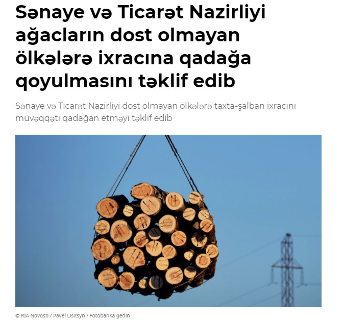 Yenə də Rusiya Federasiyasının Sənaye və Ticarət Nazirliyinin qərarına istinad etməklə, ağac, taxta və digər bu tipli malların ixracına qoyulmuş qadağaların Azərbaycanın əhatə etmədiyini görmək olar. Sənəddə qeyd olunub ki, taxta və ondan hazırlanan məhsulların ABŞ və Aİ daxil olmaqla “dost olmayan ölkələrə” ixracı qadağan edilib. Azərbaycan həmin siyahıya daxil deyil və ona görə də, taxta və ağac məmulatlarının sanksiayalarının bizə aiddiyatı yoxdur. (Mənbə)
