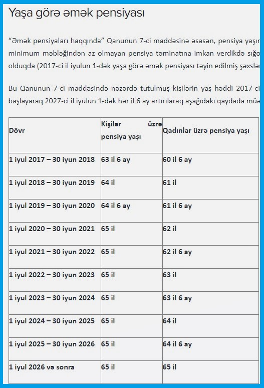 Daha sadə dillə desək, 65 yaşı tamam olan və 25 il staj toplamış hər bir Azərbaycan vətəndaşı yaşa görə əmək pensiyası alır ki, onun da məbləği 300 manatdan az deyil. 2022-ci il yanvarın 1-dən pensiyaların indeksləşdirilməsindən sonra ölkə üzrə orta aylıq pensiya 331 manata, yaşa görə pensiya 358 manata çatdırılıb. (Mənbə)