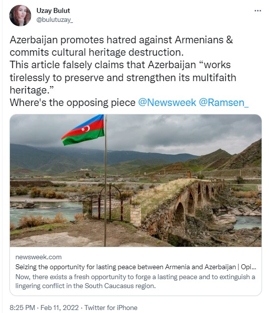 Beynəlxalq mediada ermənilərin sözçüsünə çevrilən Uzay Bulut qələmə aldığı məqalədə 27 sentyabr 2020 –ci ildə başlayan II Qarabağ savaşında Azərbaycanın “Stepanakertdə” (?!) qondarma “ Artsax Respublikasında yaşayan erməniləri hədəf aldığına diqqət çəkir. “Münaqişə zamanı Azərbaycan təkcə yaşayış məntəqələrini, o cümlədən Stepanakerti (?-red.) deyil, həm də ermənilərin mədəni və dini abidələrini də hədəf alıb”. (mənbə)