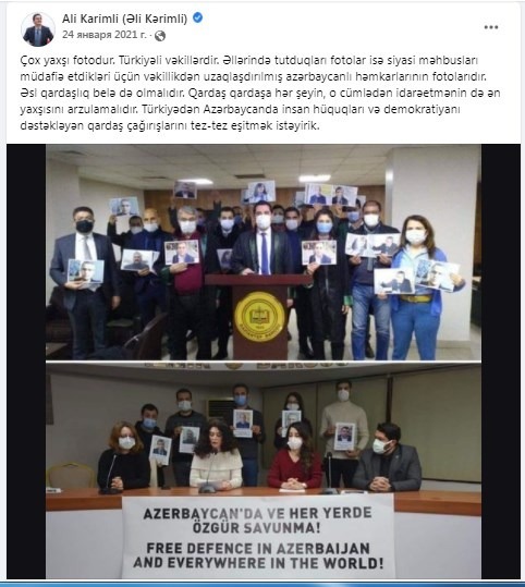 Xalqın Hüquqşunasları Bürosunun rəhbəri Ebru Timtik və 14 vəkil terror təşkilatına üzv olmaq ittihamı ilə həbs olunmuşdular. Yəni, Azərbaycana qarşı çıxış edən, fotoda gördüymüz bu şəxslər terror təşkilatının vəkilləridilər. Əli Kərimli isə bu paylaşımı ilə düşüncəsini bəlli edir.