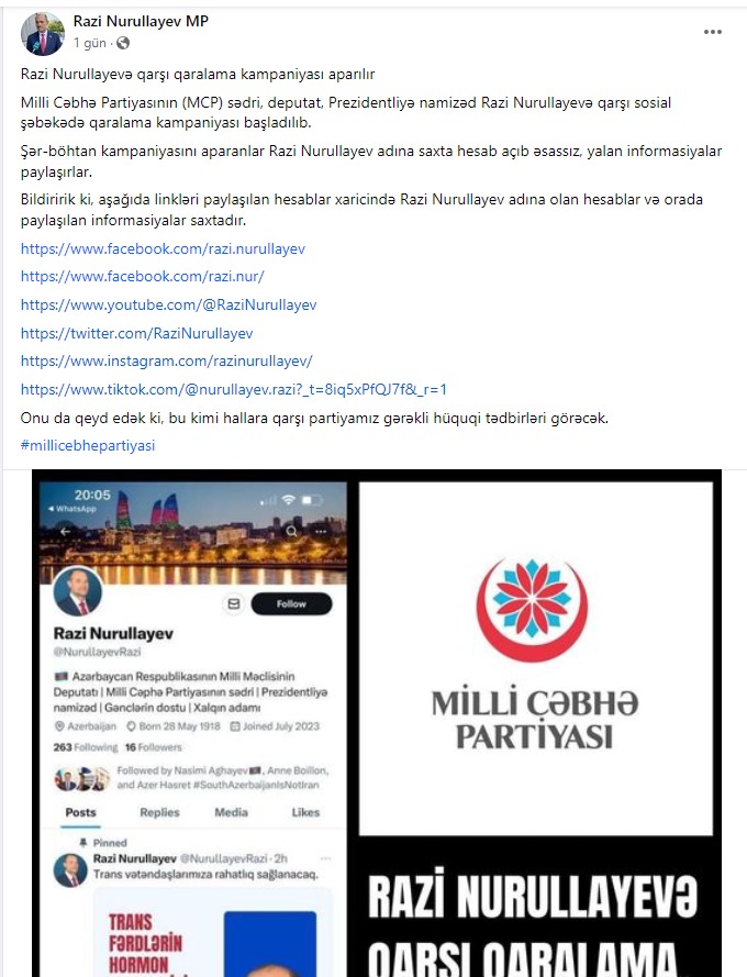 Milli Cəbhə Partiyasının rəsmi hesabında R.Nurullayevin adına açılan saxta hesablar barəsində məlumat verilib və izləyicilər bu məsələdə diqqətli olmağa çağırılıb.