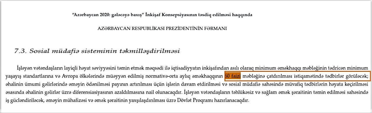 Radionun sitat gətirdiyi həmin sənəddə (“İnsan kapitalının inkişafı və səmərəli sosial müdafiə sisteminin qurulması” üzrə 7-ci bölməsinin “Sosial müdafiə sisteminin təkmilləşdirilməsi” adlı 7.3 bənd) qeyd edilir ki,“işləyən vətəndaşların layiqli həyat səviyyəsini təmin etmək məqsədi ilə iqtisadiyyatın inkişafından asılı olaraq minimum əməkhaqqı məbləğinin tədricən minimum yaşayış standartlarına və Avropa ölkələrində müəyyən edilmiş normativə -orta aylıq əməkhaqqının 60 faizi məbləğinə çatdırılması istiqamətində tədbirlər görüləcək”. mənbə
