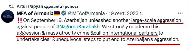 O, 28 avqust 2023 -cü ildə yazdığı statusda isə faktları təhrif edir. “Laçın koridorunun davam edən blokadası...”