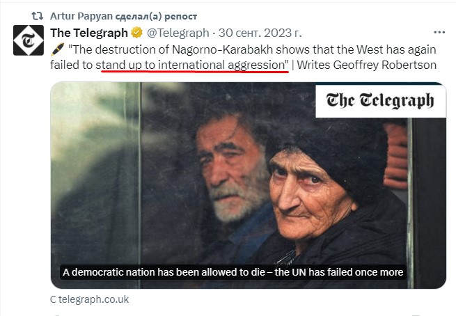 Beynəlxalq təşkilatın təmsilçisi “Freedom House”-un Ermənistan üzrə nümayəndəliyinin rəhbəri Andranik Şirinyanın Polşada keçirilən İnsan ölçüsü üzrə Varşava Konfransındakı 3 oktyabr, 2023 tarixli çıxışının videosunu təkrar paylaşaraq “@Shirinyan, səninlə və təcavüzlə bağlı hazırlanan hesabat üzərində işləyən komanda ilə fəxr edirəm” yazıb.
