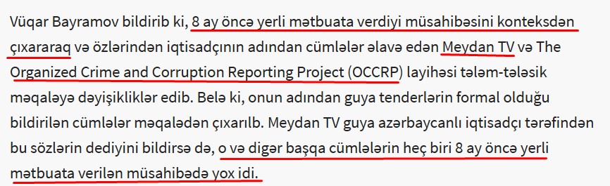 2) “OCCRP-nin araşdırmasında Azərbaycanlı QHT sədri Vüqar Bayramovun adından saxta məlumatların yayılması” faktı.