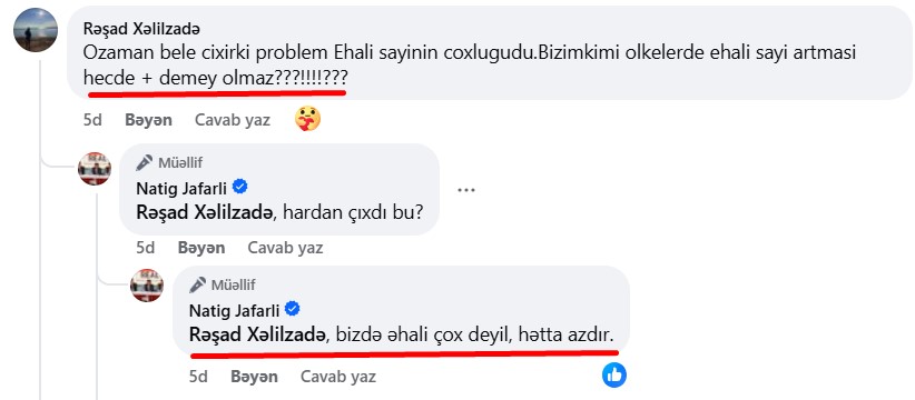 Burada bir haşiyə çıxaq. Natiq Cəfərlinin yazdığı statusda izləyicilər bu faktı müəllifin diqqətinə çatdırsalar da Azərbaycan cəmiyyətinə iqtisadçı kimi təqdim olunan partiya sədri anlaşılmaz cavablar verib və özü-özünü bir neçə dəfə təkzib edib.