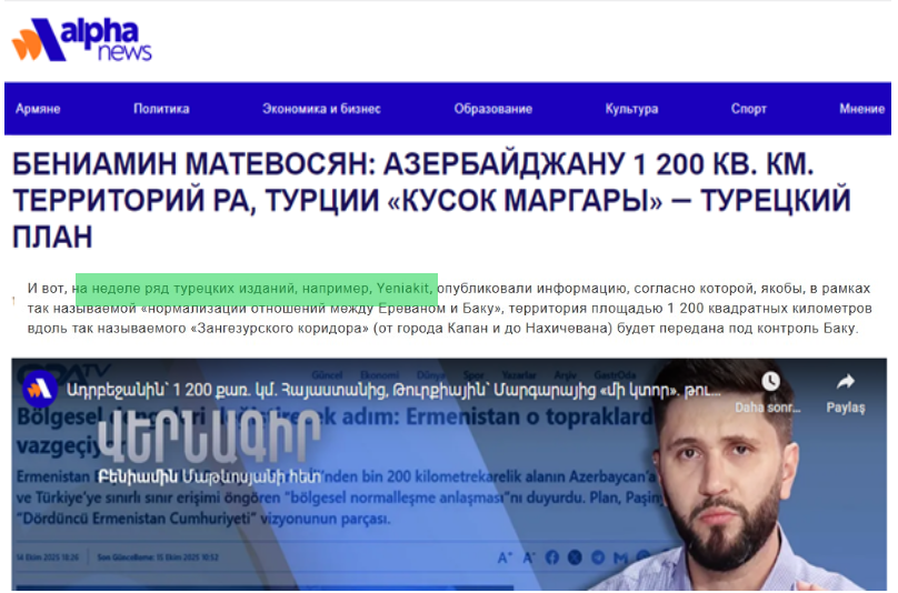 Əvvəlcə onu qeyd edək ki, axtarış zamanı nə rus, nə də erməni mənbələrində Ermənistan Baş naziri Nikol Paşinyanın bu cür açıqlamasına rast gəlmədik. Əvəzində erməni politoloq Benjamin Matevosyanın “Alphanyus.am” saytına verdiyi açıqlamada mövzunun “Yeni Akit” qəzetində (son dövrlərdə Azərbaycana qarşı qərəzli mövqeyi ilə seçilir-red.) yayılması barədə açıqlamasını aşkarladıq.