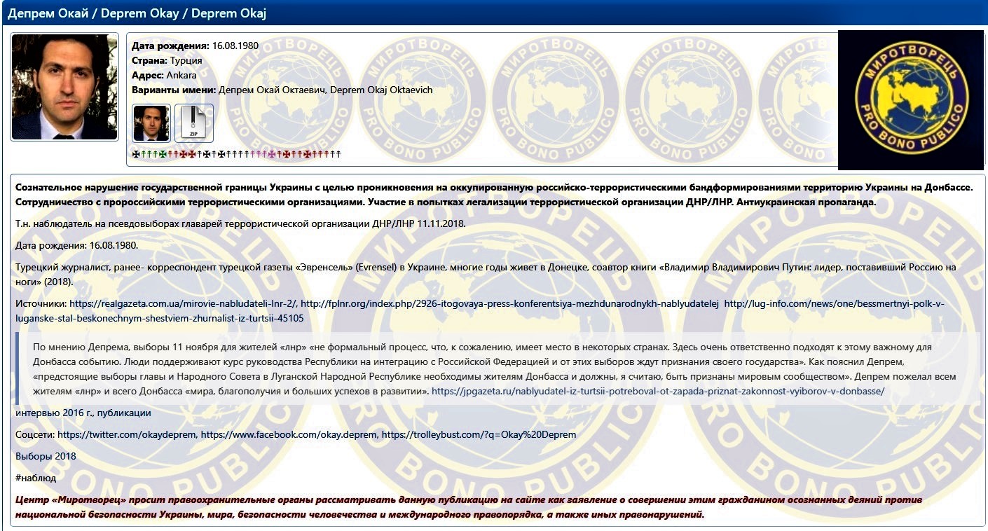 Saytda bu şəxs haqqında qeyd olunub ki, o, terrorçu silahlı qruplar tərəfindən işğal olunmuş Donbasda Ukrayna ərazisinə daxil olmaq üçün dövlət sərhədini qəsdən pozub. Həmçinin, Rusiyayönlü terror təşkilatları ilə əməkdaşlıq, “DXR/LXR” terror təşkilatını qanuniləşdirmək cəhdlərində iştirak edib və Ukrayna əleyhinə təbliğat aparıb. Bundan başqa, onun 11 noyabr 2018-ci ildə “DXR/LXR” terror təşkilatı liderlərinin psevdoseçkisində “müşahidəçi” kimi iştirak etdiyi də qeyd edilib. myrotvorets.center