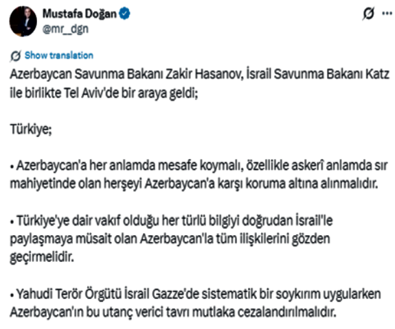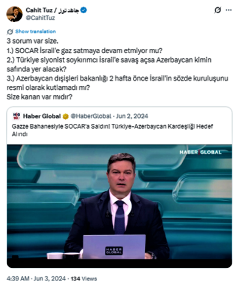 3. Bu şəxsin "Haber Global" telekanalının haqlı olaraq hazırladığı “Qəzza bəhanəsiylə SOCAR-a hücum Türkiyə ilə Azərbaycan arasında münasibətlərin korlanması üçündür" başlıqlı reportajına görə hədəfə gətirməsi də yuxarda qeyd etdiyimiz mərkəzlərin ssenarisi ilə hərəkət etdiyinə işarədir.