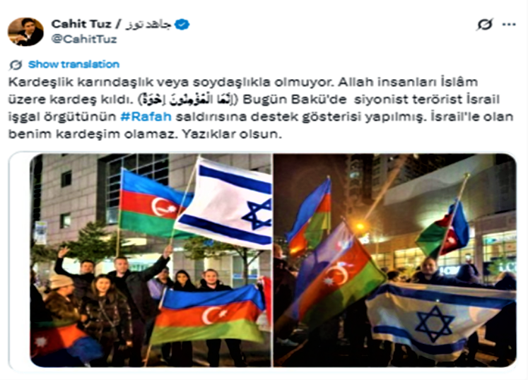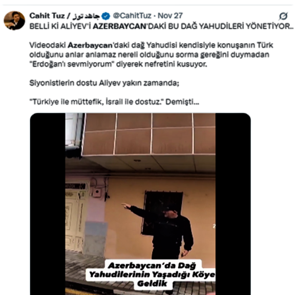- "Qardaşlıq soydaşlıqla ya da ailə bağları ilə olmur. Allah insanları İslam dinində qardaş qılıb" cümlələri ilə başlayan statusunda Cahit Tuz guya Bakıda yəhudilərə dəstək aksiyasının keçirilməsi ilə bağlı fotolar paylaşıb.