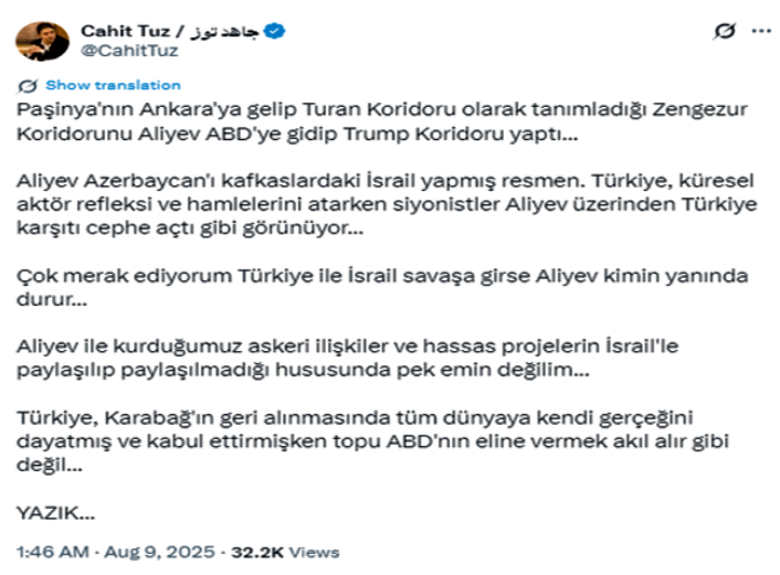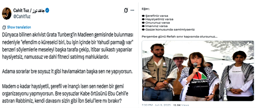 7. Sonda bir məqamı da qeyd edək ki, Azərbaycanı hər addımbaşı ittiham edən Cahit Tuz Qreta Turnberqə dəstək verir, onu tənqid edən insanların üstünə hücuma keçir. Hətta, onun Fələstinlə bağlı fəaliyyətini "Allahın Əbu Cəhlə Kəbə örtüyü asdırması" ilə müqayisə edir.