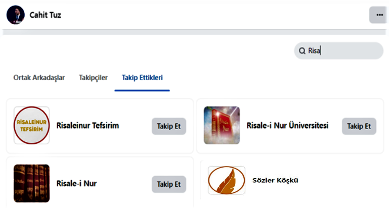 C.Tuzun “Facebook”-da izlədiyi səhifələr arasında “nurçu”luğu təbliğ edən xeyli səhifə var: