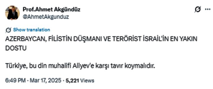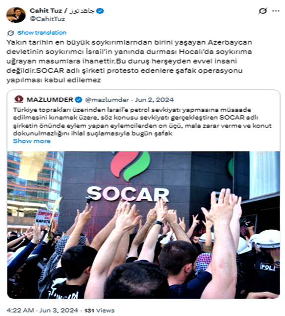 Onu da qeyd edək ki, həmin günlərdə Cahit Tuzun “Mazlumder”-in SOCAR-a qarşı aksiyasında iştirak edənlərə əziyyət verilməsi ilə bağlı paylaşdığı saxta statusu yenidən paylaşması ilə bunların eyni mərkəzdən idarə olunduğunu təsdiqləmişdir.