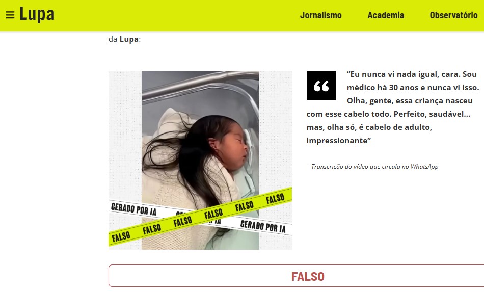 Bir müddət sonra bu məlumat “Lupa” və “Boatos” agentliklərinin braziliyalı faktyoxlayıcıları tərəfindən təkzib edilib. “Lupa”nın əməkdaşlarının sözlərinə görə, yeni doğulan körpə ilə bağlı xəbərlər “WhatsApp”-da geniş yayılıb (ehtimal edilir ki, ilkin dəfə burada yayılıb). Videonu yoxlamaq üçün “Lupa” faktyoxlayıcıları Süni İntellekt tərəfindən yaradılan məzmunu (AI or Not, Hive, Sight Engine) aşkar edən bir neçə alətdən istifadə ediblər və onların hamısı əminliklə videonun saxta olduğunu bildiriblər.