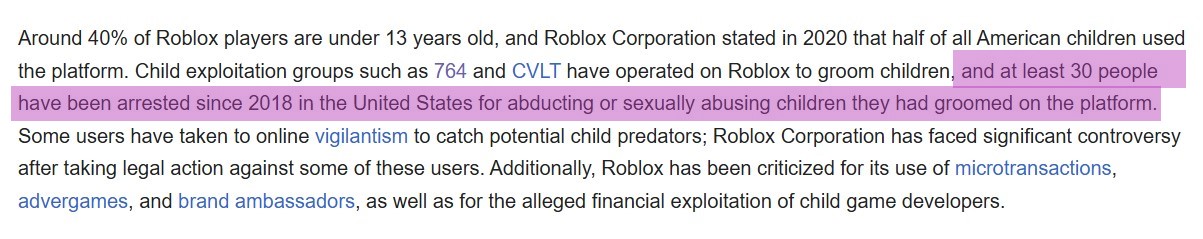 2018-ci ildən bəri ABŞ-də “Roblox” vasitəsilə tanış olduqları uşaqları qaçırdıqları və ya cinsi təcavüz etdikləri üçün ən azı 24 nəfərin, 2025-ci ilin iyun ayına qədər daha altı nəfərin həbs olunduğu mediada bildirilib.