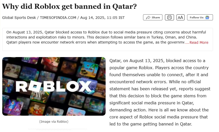 2026-cı ilin yanvar ayından etibarən “Roblox” Əlcəzair, Çin, İraq, Oman, Qətər, Rusiya və Türkiyədə bloklanıb və ya məhdudlaşdırılıb.