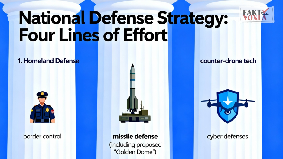 Bəlkə də ən diqqətəlayiq məqam odur ki, strategiya onilliklər ərzində ilk dəfə olaraq daxili müdafiəni ən yüksək prioritetə qaldırır. ABŞ ərazisinə qanunsuz miqrasiya, narko-terrorizm, kibermüharibə, dron texnologiyası və raket sistemləri də daxil olmaqla yönələn təhdidlər artıq ənənəvi hərbi rəqiblərlə eyni səviyyədə qiymətləndirilir.