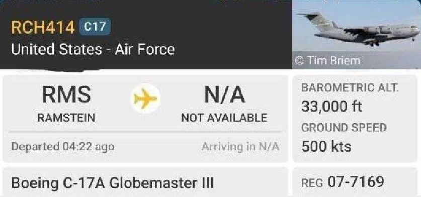 “Flightradar24” platformasından götürülmüş ekran görüntüsündə həqiqətən də Ramşteyn Hava Bazasından (Almaniya) Xəzər bölgəsinə uçan ABŞ Hərbi Hava Qüvvələrinə məxsus “Boeing C-17A Globemaster III” (quyruq nömrəsi RCH414) qeydə alınıb.