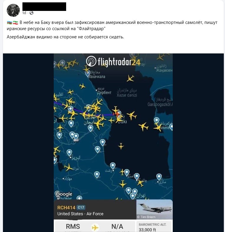 “Facebook”-da Bakı üzərindən uçan təyyarələrdən birinin “Flightradar” təyyarə izləmə platformasından götürülmüş ekran görüntüsü paylaşılaraq “İran mediasının “Flightradar”-a istinadən verdiyi məlumata görə, dünən Bakı səmasında Amerika hərbi nəqliyyat təyyarəsi görünüb. Görünür, Azərbaycanın kənarda qalmaq fikri yoxdur.”-qeydi yazılıb.