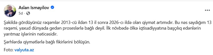 Sosial mediada Azərbaycanda 2013-2026-cı illər arasında ərzaq məhsullarının qiymət fərqini əks etdirən cədvəl paylaşılır. İddia edilir ki, son 13 il ərzində Azərbaycanda qiymətlər kəskin şəkildə bahalaşıb. Sosial media istifadəçiləri bildirirlər ki, qiymət artımları dünyada gedən proseslərlə bağlı deyil, iqtisadi idarəetmədəki yarıtmaz işlərin nəticəsidir.
