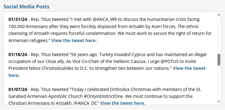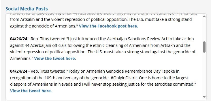 Dina Titus tək Konqresdəki ermənipərəst fəaliyyəti ilə deyil, sosial mediada anti-Azərbaycan kampaniyasında aktivliyi ilə də diqqət çəkib.