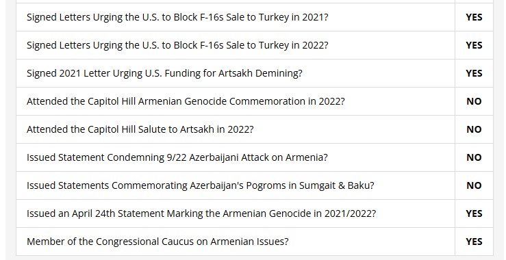 O, bu qiymətləri qondarma “erməni soyqırımı” Təhsili Qanununa (HR7555) həmmüəlliflik etdiyi, erməni əsirlərinin azad edilməsinə çağıran birgə qətnaməni (H.Res.240), Azərbaycanın Ermənistana “hücumunu” pisləyən qətnaməni (H.Res.1351), 2021-ci ildə ermənistanpərəst xarici yardım prioritetlərini dəstəkləyən məktubu, ABŞ-nin terrorçu rejimə yardımını genişləndirmək üçün erməni Bürosunun 2022-ci il məktubunu, ABŞ-ni Azərbaycana hərbi yardımı dayandırmağa çağıran 2021-ci il məktubunu, 2021-ci ildə prezidentə Erməni Soyqırımını tanımağa çağıran məktubu, ABŞ-ni Türkiyəyə dron texnologiyasının ötürülməsinin qarşısını almağa çağıran məktubu, ABŞ-ni 2021 və 2022-ci illərdə Türkiyəyə “F-16” satışını dayandırmağa çağıran məktubu və s. sənədləri imzaladığı üçün alıb.