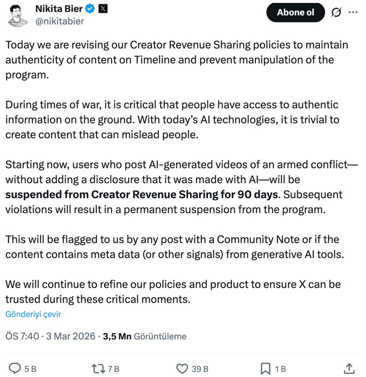 “X” sosial media platformasının məsul meneceri Nikita Bier, “X” hesabından açıqlama verərək, platformada “Kontent Yaradıcısının Gəlir Paylaşımı” siyasətində bəzi dəyişikliklərin edildiyini bildirib. Bier bildirib ki, mövcud süni intellekt texnologiyasından istifadə edən insanları yanlış istiqamətləndirən şəkil və videoların yayımı yolverilməzdir və müharibə dövründə insanların bölgədən dəqiq məlumatlara çıxış əldə etməsi vacibdir.
