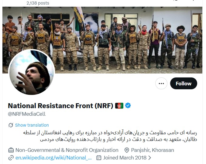 Əvvəlcə, yayılan məlumatda istinad kimi təqdim edilən Əfqanıstan Milli Müqavimət Cəbhəsinin sosial media hesablarını yoxladıq. Məlum oldu ki, “X” sosial media platformasında bu adda 2 profil mövcuddur. Bunlardan biri “Əfqanıstan Milli Müqavimət Cəbhəsi” (National Resistance Front of Afghanistan), digəri isə “Milli Müqavimət Cəbhəsi”dir (National Resistance Front (NRF).