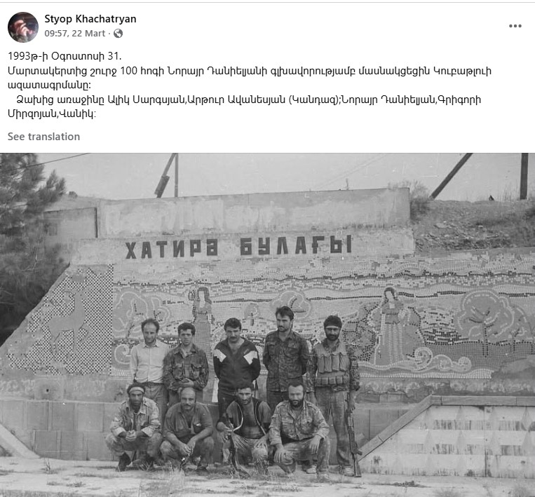 Paylaşımda yazılıb: 31 avqust 1993-cü il. Kubatlunun azad olunmasında Norayr Danielyanın rəhbərlik etdiyi Martakertdən 100-ə yaxın insan iştirak edib. Soldan birinci Alik Sarqsyan, Artur Avanesyan (Kandaz); Norayr Danielyan, Qriqori Mirzoyan, Vanik.
