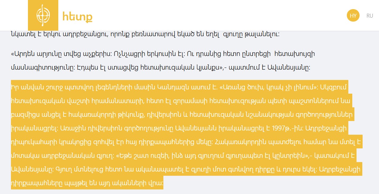 Diqqət yetirdiksə, erməni mediasında dərc olunan bu məqalənin ekran görüntüsünü erməni dilində verməyə məcbur olduq. Çünki həmin məqalənin həm rus, həm ingilis dilində olan tərcümə versiyaları saytdan silinib. Səbəb yəqin ki, Azərbaycanlı dinc sakinlərə və hərbçilərə qarşı törədilən terror aktının açıq-aşkar etirafıdır.