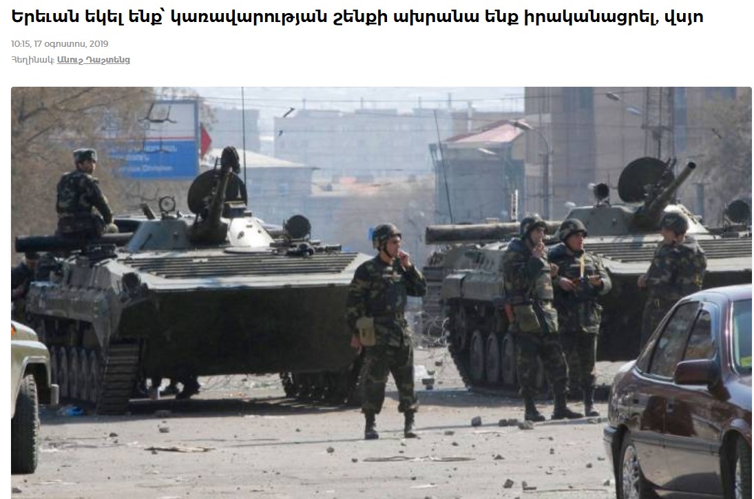Fikirlərimizi təsdiqləmək üçün vacib bir detalı da xatırladırıq. 17 avqust 2019-cu il tarixində “hrapark”-da Anuş Dantesin imzası ilə “Biz İrəvana hökumət binasını mühafizə etmək üçün gəlmişdik, anlayırsınız bunu?” başlıqlı məqalə dərc olunub. Məqalə 1 mart 2008-ci ildə Ermənistanın paytaxtında mitinq iştirakçılarına atəş açılması nəticəsində qətlə yetirilən şəxslərin işi ilə bağlı aparılan istintaq işinin materialları əsasında hazırlanıb.