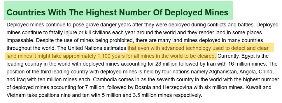 - BMT-nin hesablamalarına görə, yerüstü minaların aşkarlanması və təmizlənməsi üçün istifadə edilən qabaqcıl texnologiya ilə belə, dünyada bütün minaların təmizlənməsi təxminən 1100 il çəkə bilər. worldatlas