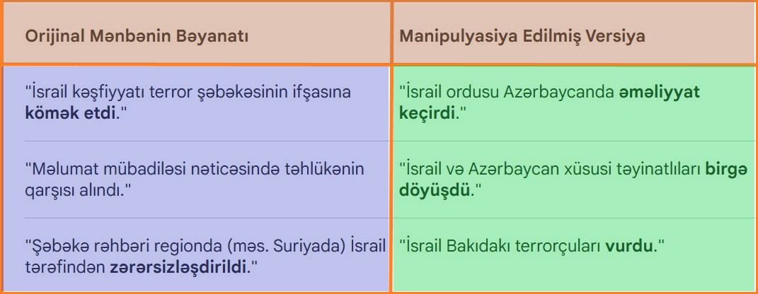 - "İsrail ordusu iştirak edib" manipulyasiyası: Orijinal mətndə aydın şəkildə bildirilir ki, İsrail tərəfi yalnız kəşfiyyat məlumatlarını paylaşıb, əməliyyatı isə yerli təhlükəsizlik orqanları icra edib. İsrail ordusunun Azərbaycan daxilində hər hansı fiziki əməliyyatda iştirakı barədə heç bir məlumat yoxdur.