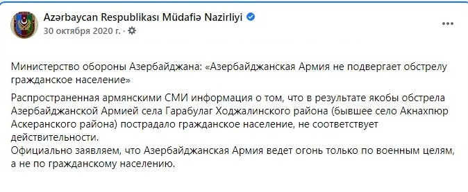 The Azerbaijani Defense Ministry reacted dryly to the disinformation, pointing out on its official Facebook page that the information disseminated by the Armenian media that the civilian population was injured as a result of the alleged shelling of the Garabulag village in the Khojaly district by the Azerbaijani Army was untrue.
