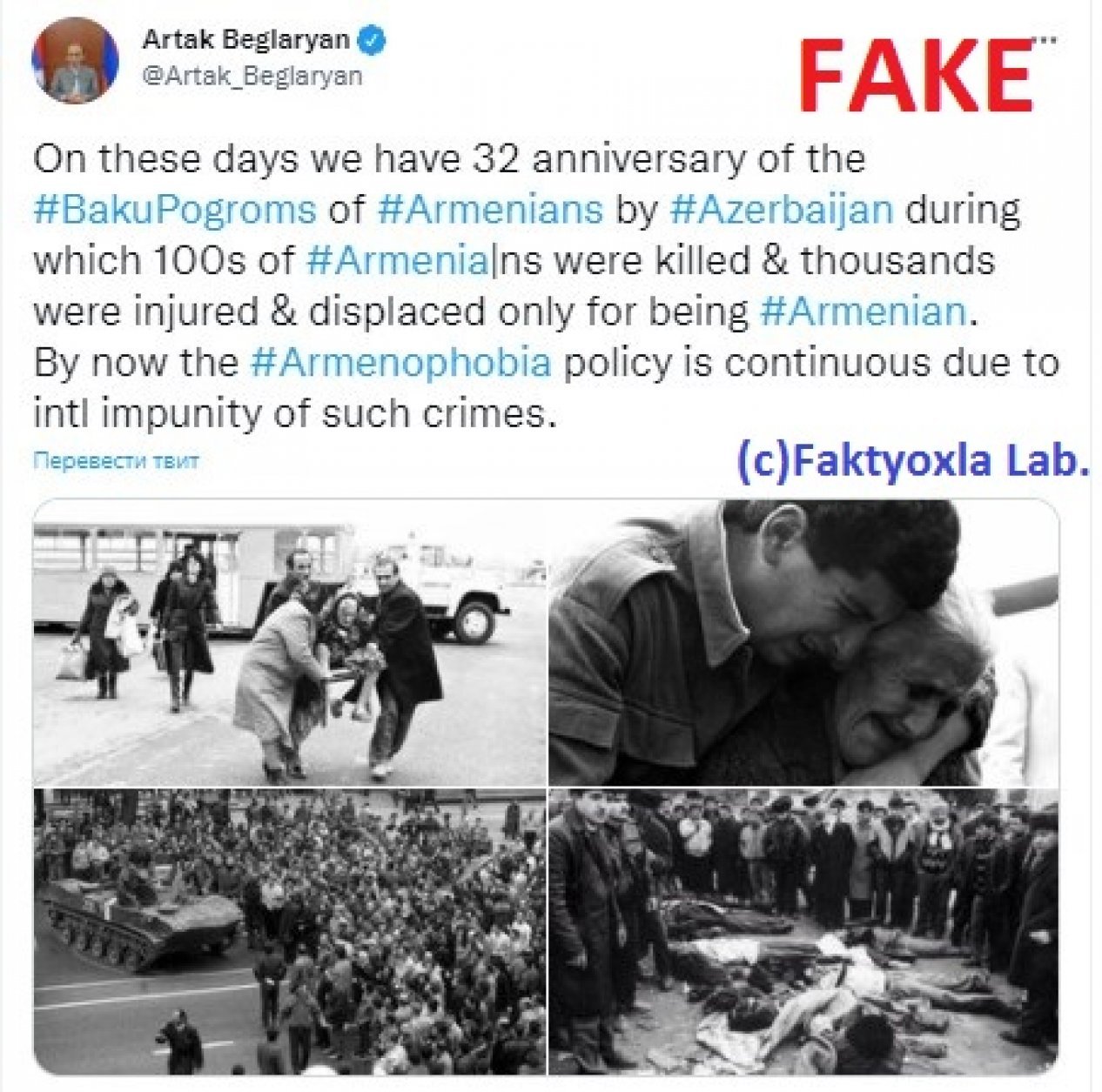 Conclusion: The words written by Artak Beglaryan are of manipulative nature, the facts have been distorted. The shared photos have nothing to do with the events that took place in Baku.