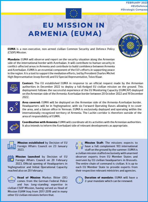As is known, the civilian mission of the European Union within the Common Security and Defense Policy (CSDP) has been operating in Armenia since February 20, 2023. The purpose of the mission is to contribute to peace and stability in the border areas of Armenia and Azerbaijan, as well as to support the creation of trust between the two countries in the process of delimitation and demarcation.