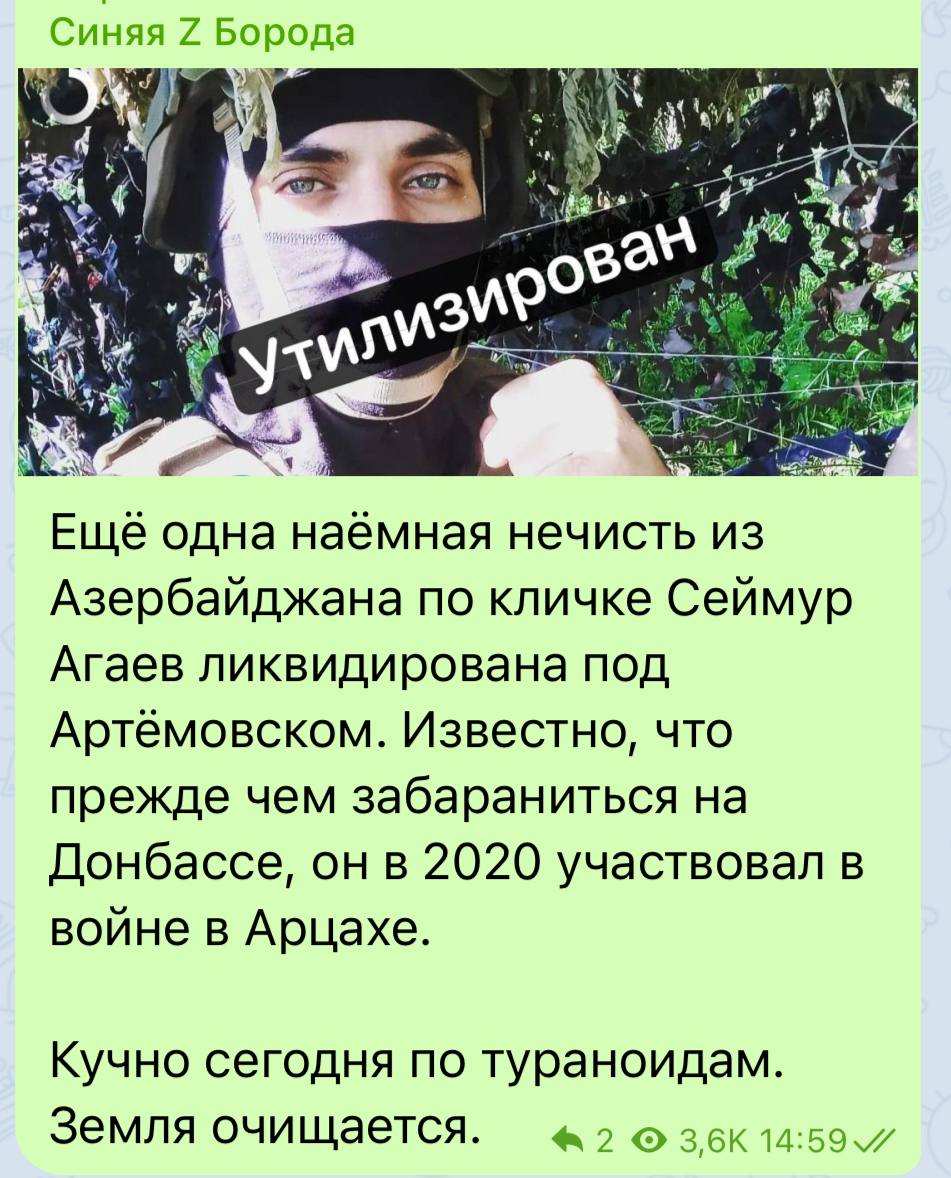 Timofey Yermakov, a member of the anti-Azerbaijani media network during the Second Karabakh War, distinguished by his pro-Armenian position, presents himself as a military journalist and is disseminating propaganda information about the Ukrainian war on his "Sinyaya Z Boroda" (Blue Z Beard) Telegram channel. In one of his posts, he reported about Azerbaijani Seymur Aghayev, who according to him died near Artyomovsk (Bakhmut). The text, written with very insulting and insolent words, also mentions that Seymur Aghayev fought in the 2020 Karabakh War.