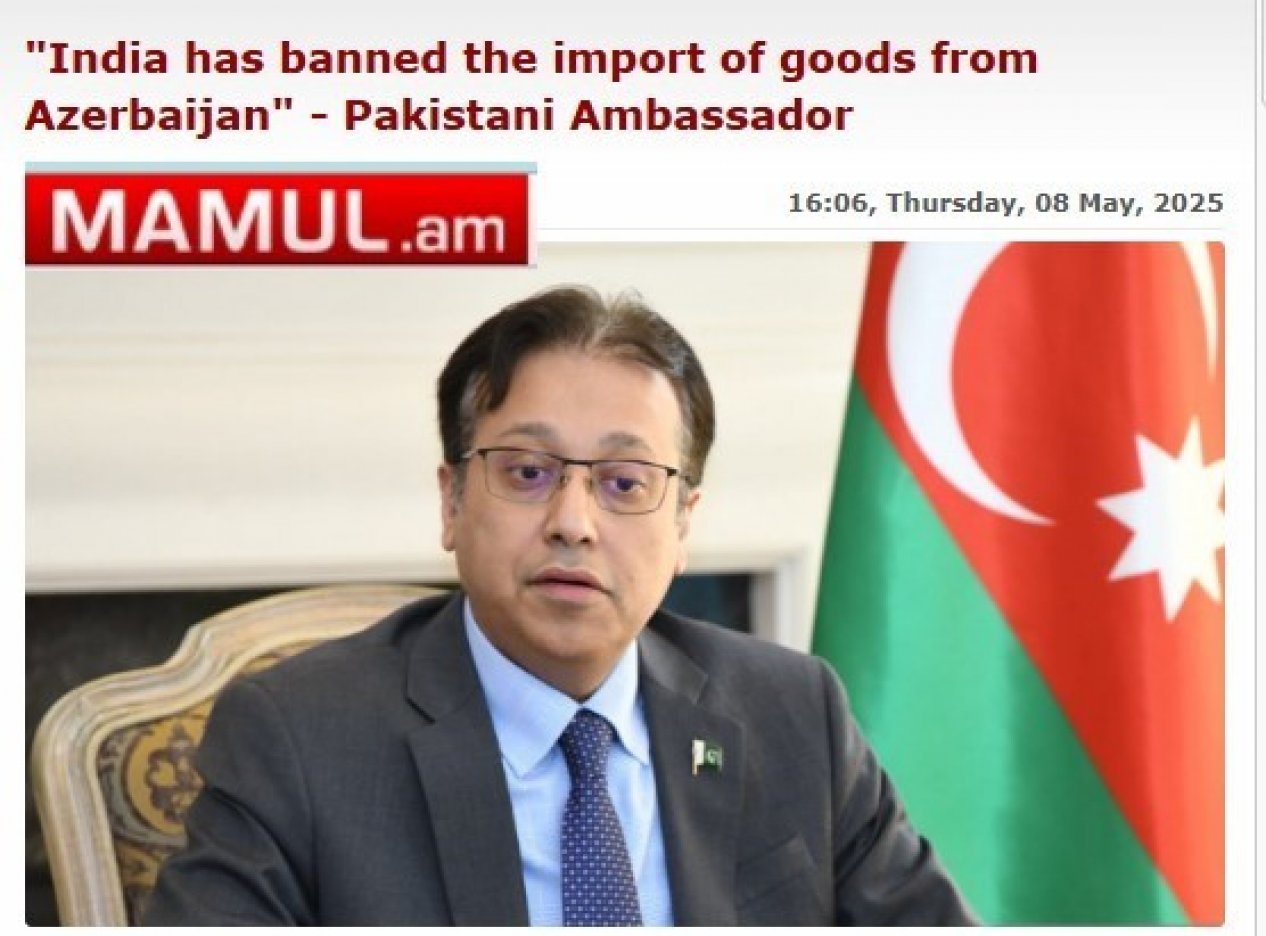 Armenian media outlets have reported that: ""According to my information, India has imposed a ban on the import of goods from Azerbaijan. This is a very wrong decision."  As reported by APA, this statement was made by Pakistan’s Ambassador Extraordinary and Plenipotentiary to Azerbaijan, Qasim Mohiuddin, during a press conference".