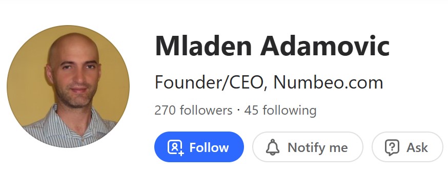 Since 2012, Numbeo has been incorporated as NUMBEO DOO Beograd-Palilula LLC, led by Mladen Adamović. Adamović has stated that the site’s revenue is derived from advertising and API subscriptions.