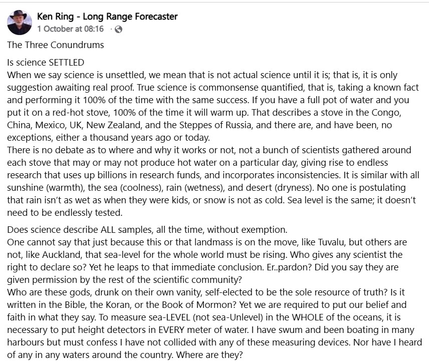 The post also questions evidence of sea level rise, claiming that the only way to measure changes in sea level in all oceans is "to put height detectors in EVERY meter of water".